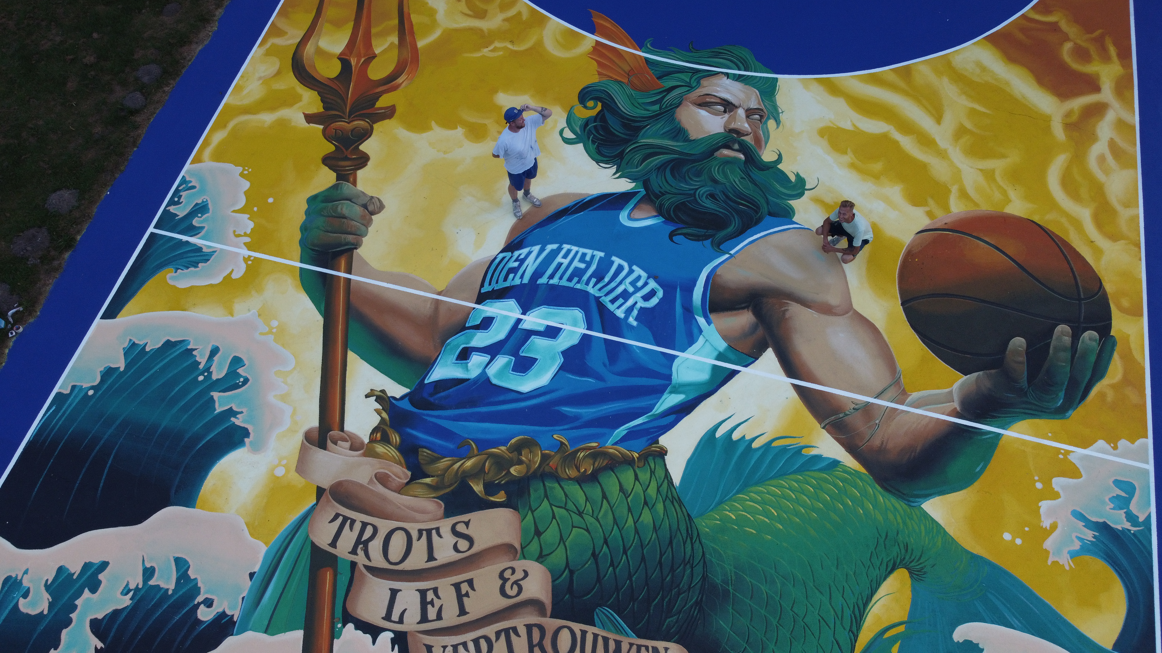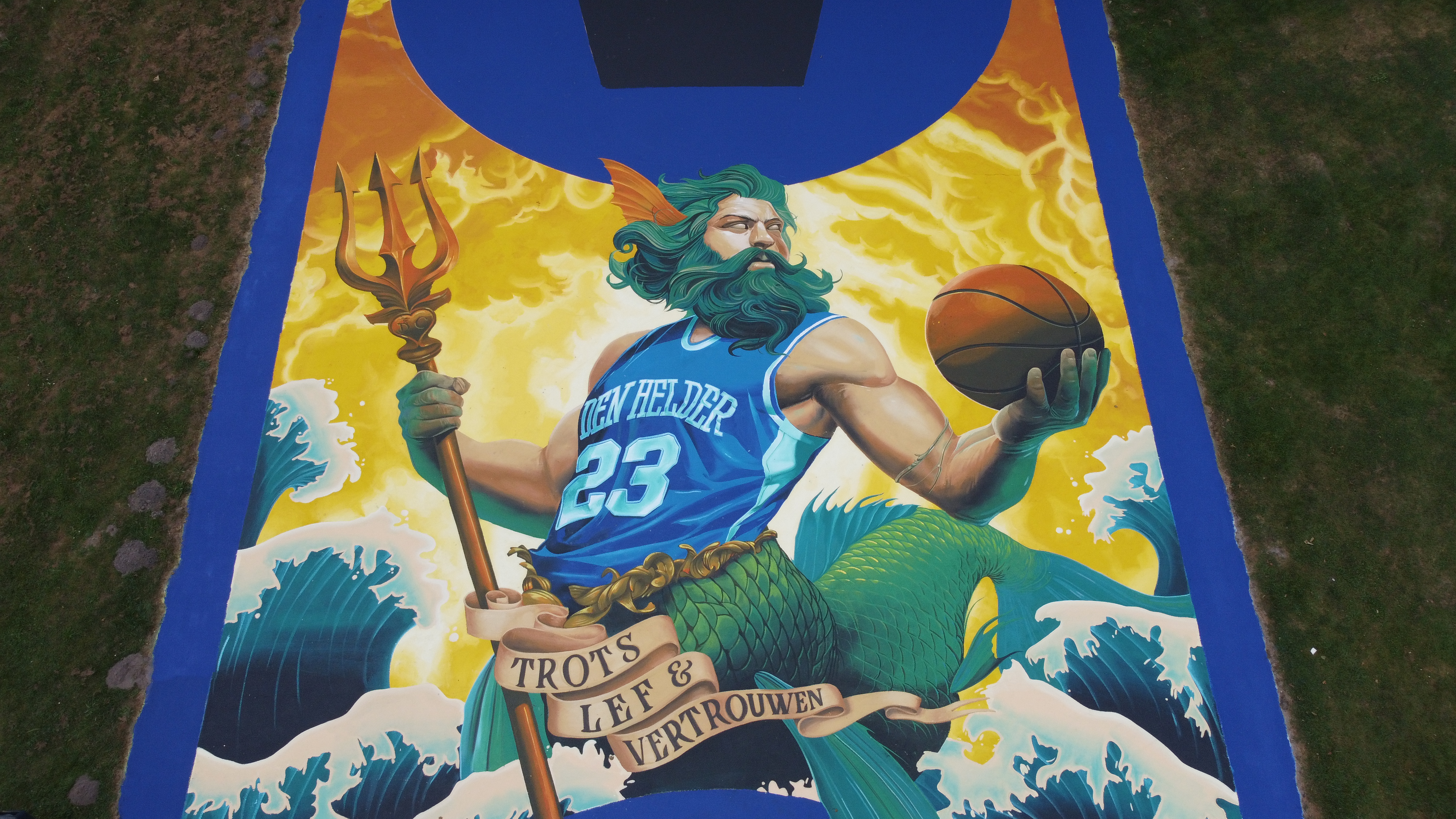 The design is a bold and bright depiction of the Lord of the Seas, Poseidon or Neptune. A reference to the city of Den Helder, which is strattled by both the North sea in the west and the Wadden sea in the east.